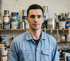 Junger Mann mit dunklem T-Shirt und verschränkten Armen lächelt in einem modernen Büro.