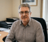 Lächelnder junger Mann im dunklen Anzug mit verschränkten Armen vor unscharfem Bürohintergrund.